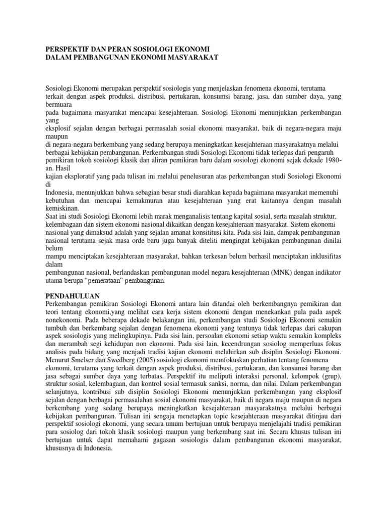 Sosiologi Ekonomi merupakan perspektif sosiologis yang menjelaskan fenomena ekonomi Citation.