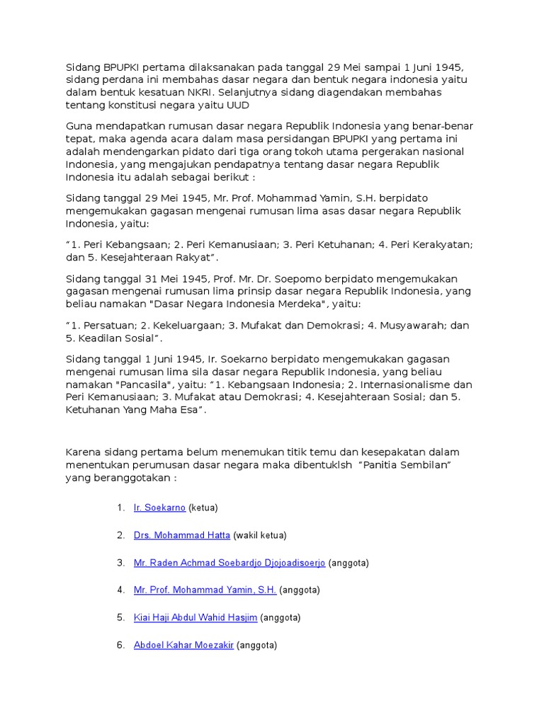 Sidang Pertama Bpupki Membahas Tentang. Hal ini akhirnya membuat para anggota sepakat untuk membentuk Panitia sembilan. Agenda sidang BPUPKI kali ini membahas tentang wilayah Negara Kesatuan Republik Indonesia, kewarganegaraan Indonesia, rancangan Undang-Undang Dasar, ekonomi dan keuangan, pembelaan negara, serta pendidikan dan pengajaran.